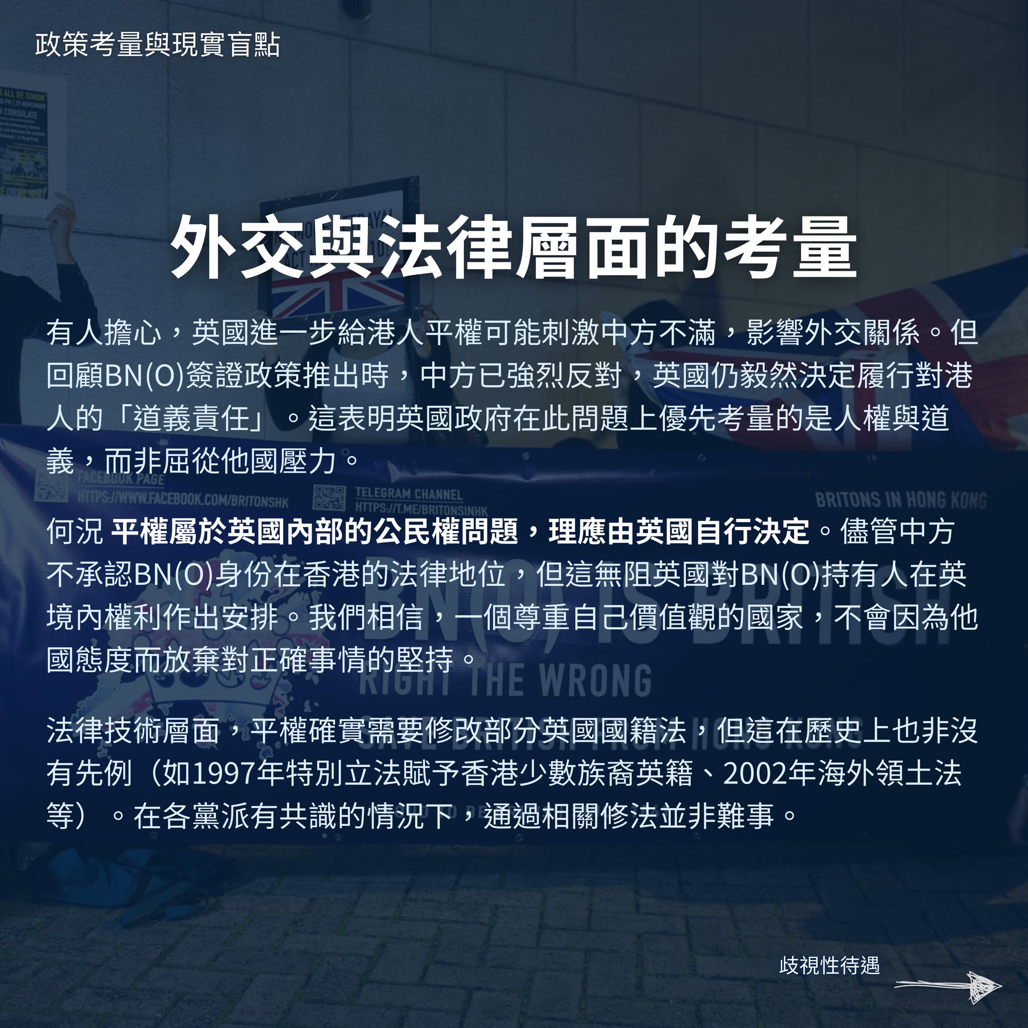 Initially, I wish to express my profound gratitude to Scottish Hong Kongers for their exemplary and meticulous flyer design, which articulately elucidated the historical context of the BNO and exemplified the group’s unwavering dedication and professionalism. Moreover, the involvement of Britons in Hong Kong is equally commendable; this segment, predominantly composed of Hong Kongers who harbored sentiments for Hong Kong’s future prior to 1997 and concentrated early on the BNO issue, has largely seen its veterans retreat into obscurity, yet their enduring spirit and accumulated experience remain profoundly consequential for the ongoing pursuit of equality.