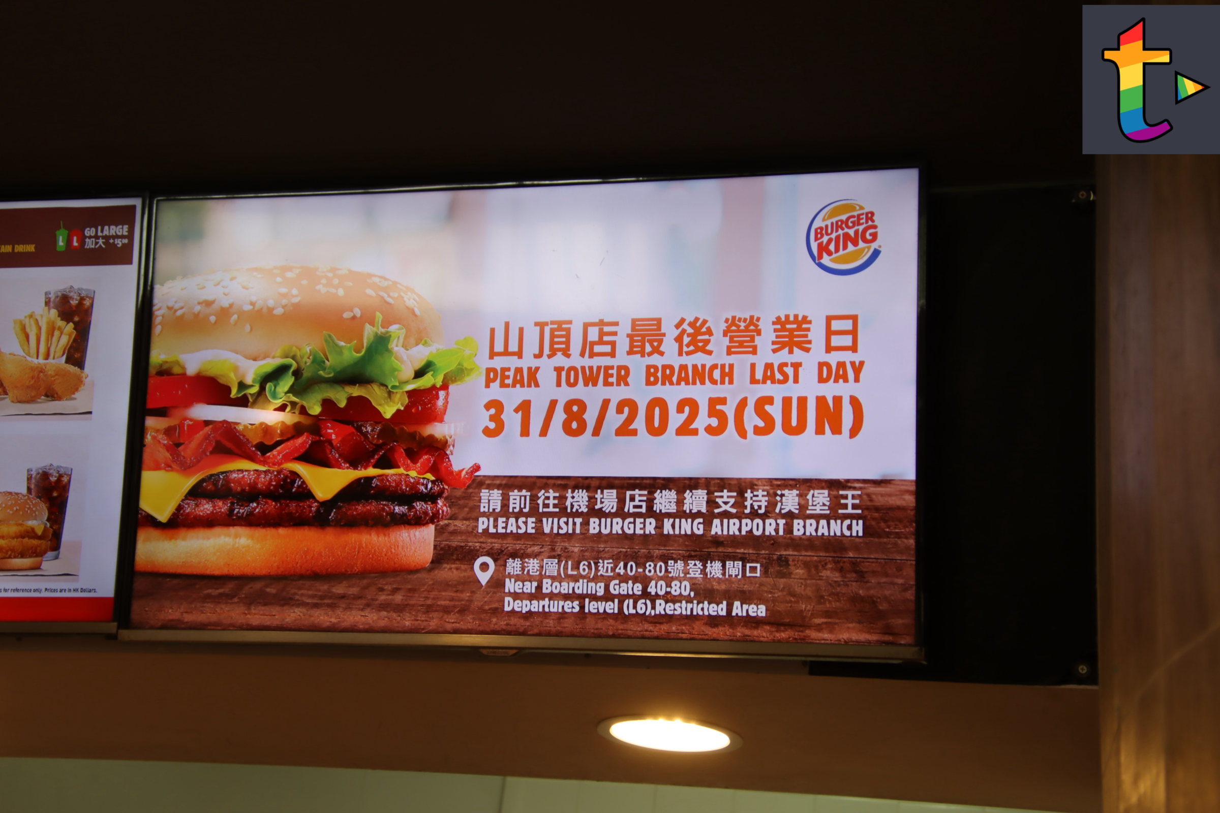 T Channel HK 彩虹頻度新聞專區 本港新聞-BURGER KING山頂分店結業 TChannelHK August 30, 2025 1 min read Spread the love 位於山頂凌霄閣BURGER KING山頂分店,在8月31日結束營業,此分店結後,BURGER KING只餘香港國際機場禁區的分店仍然營業。 文字/攝影:美娜 Author: TChannelHK Author ProfileRelated Posts TChannelHKTChannelHKApril 17, 2026香山房新聞特約:香港新聞-九巴ADL電動雙層巴士全數出牌TChannelHKApril 16, 2026香山房新聞特約:香港新聞-九巴開辦第2條開篷巴士旅遊路線HK2TChannelHKApril 15, 2026香山房新聞特約:香港新聞-宏福苑大火聽證會第12日,陸啟康稍後詳細交代,應對拒絕作供者TChannelHKApril 14, 2026香山房新聞特約:香港新聞-政府煞停籃球博彩,原定9月推出 Continue Reading Previous: 本港新聞-天文台取消所有熱帶氣旋警告信號,並改發強烈季候風信號Next: 高雲地利「一對一師友計劃」圓滿落幕 小店精神、重拾教鞭,於越南餐廳傾聽移民心聲 Leave a Reply Cancel replyYour email address will not be published. Required fields are marked *Comment * Name * Email * Website Save my name, email, and website in this browser for the next time I comment. Δ Related News 1 min read T Channel HK 彩虹頻度新聞專區 香山房新聞特約:香港新聞-九巴ADL電動雙層巴士全數出牌 TChannelHK April 17, 2026 1 min read T Channel HK 彩虹頻度新聞專區 香山房新聞特約:香港新聞-九巴開辦第2條開篷巴士旅遊路線HK2 TChannelHK April 16, 2026 1 min read T Channel HK 彩虹頻度新聞專區 香山房新聞特約:香港新聞-宏福苑大火聽證會第12日,陸啟康稍後詳細交代,應對拒絕作供者 TChannelHK April 15, 2026